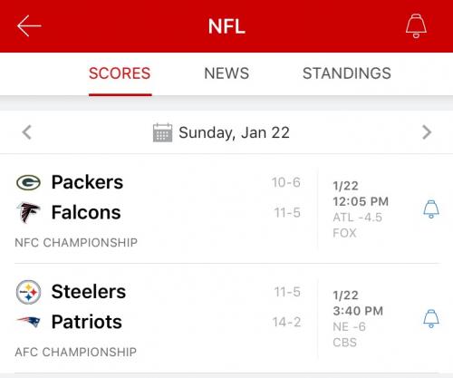 It's down to 4 teams. Sunday's going to be a fun day. Remember to get up at the breaks. Half time is best spent tossing a football around outside. Don't just be a lazy bum and watch the tv all day.