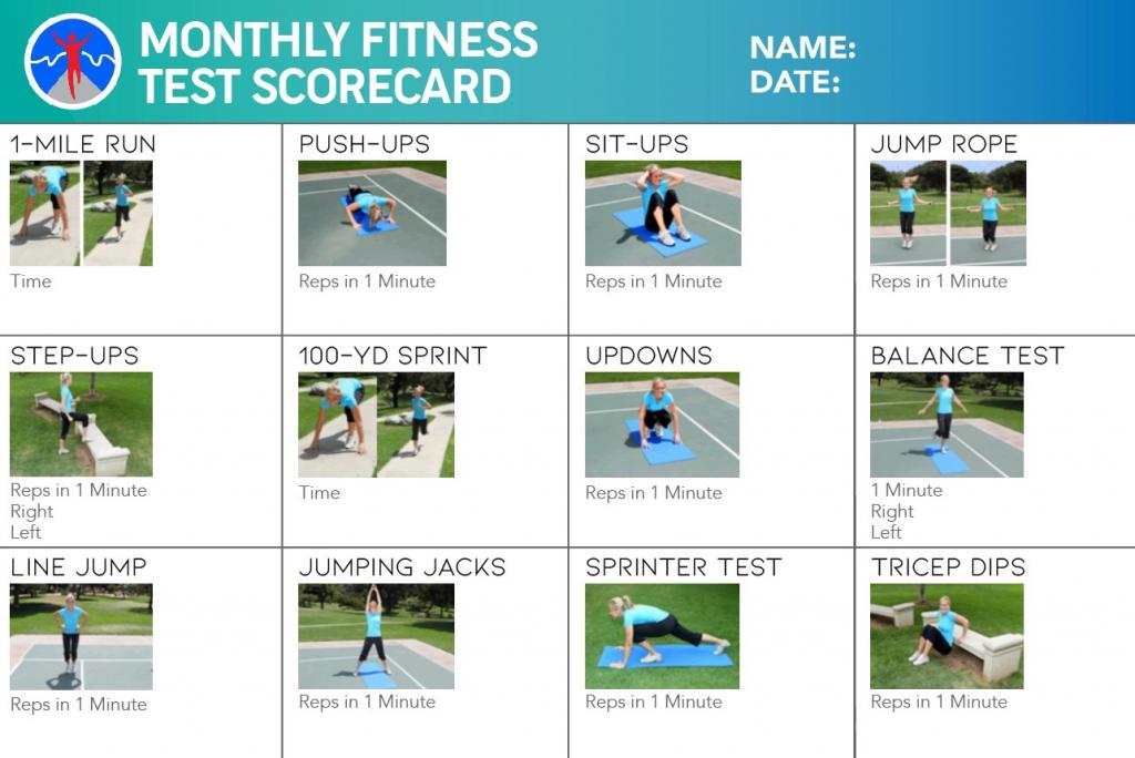 Here they are...our fitness test consists of 12 exercises. These will keep you fit and healthy your whole life. Move your body! Challenge yourself! Be Strong = Live Long!