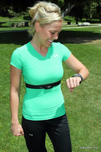 Director Lauren checking her heart rate monitor. This lets her check to see that she is challenging her heart during exercise.